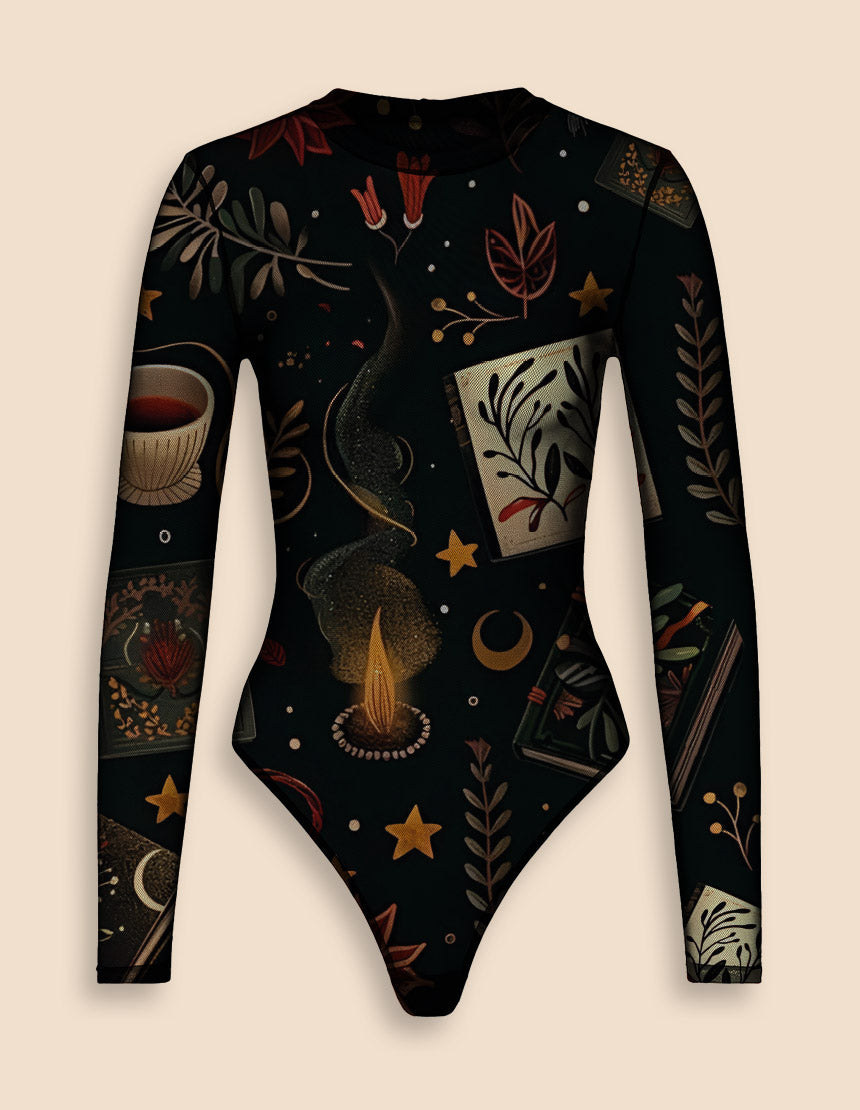 Body Mesh semitransparente, estampado, color de fondo negro, textura suave y elástica.