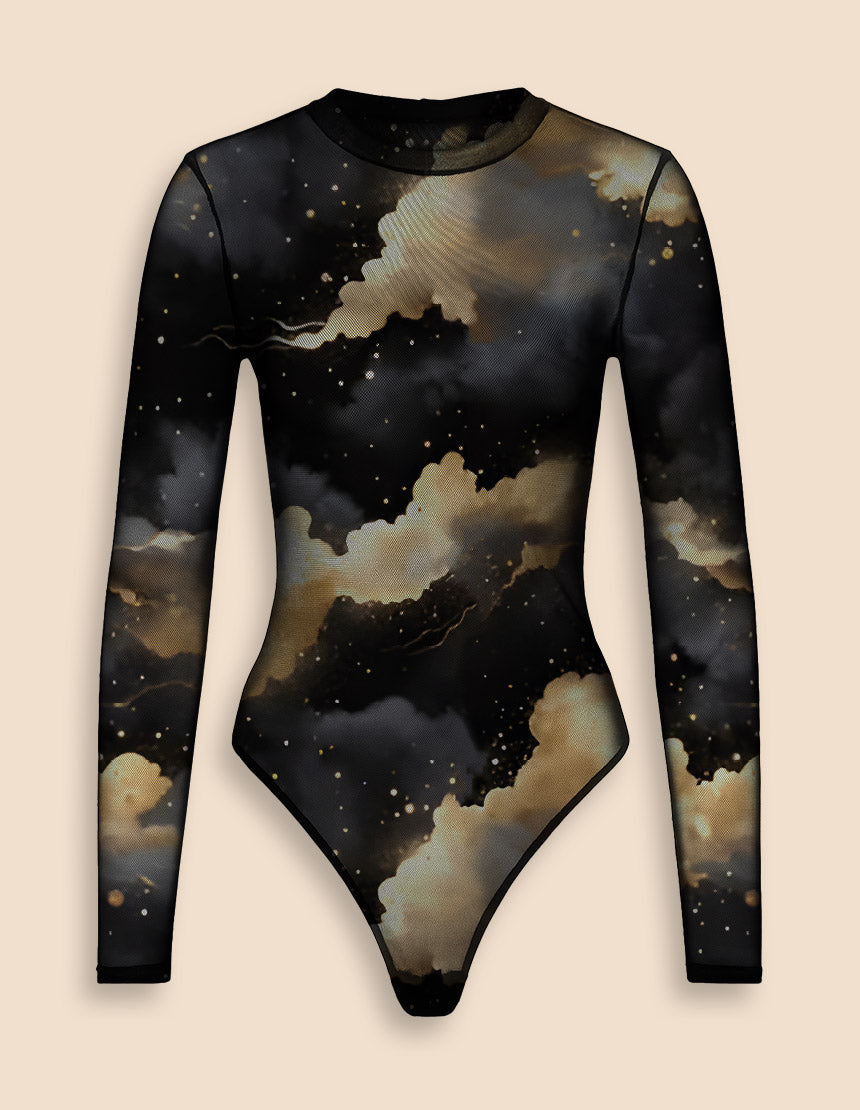 Body Mesh semitransparente, estampado de Nubes y elementos astrales, textura suave y elástica.