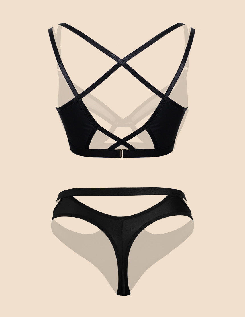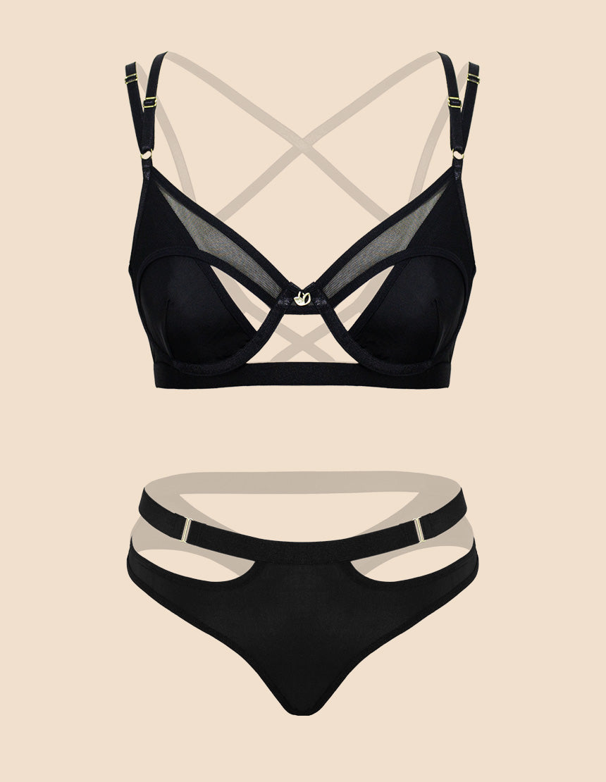 Este Set es la pieza que tu armario estaba pidiendo: sexy, audaz y diseñada para empoderarte en cada momento. Las tiras de elástico que cruzan en las copas, el juego de cortes y de transparencias crean un diseño único que no solo resalta tus curvas, sino que te ofrece un soporte seguro, dándote la confianza para destacar. Cada detalle ha sido pensado para elevar tu look, haciendo de esta prenda mucho más que un accesorio: es una herramienta de seguridad y empoderamiento.