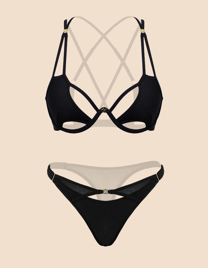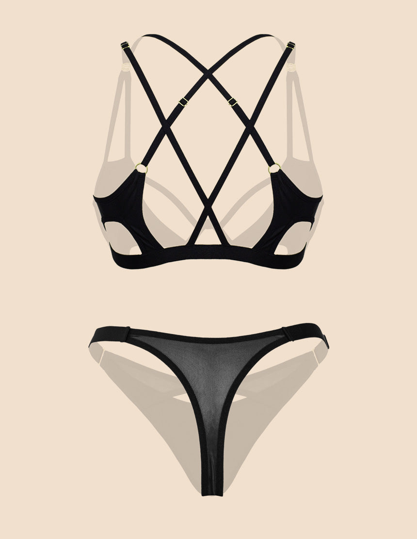 Este Set es la pieza que tu armario estaba pidiendo: sexy, audaz y diseñada para empoderarte en cada momento. Las tiras de elástico que cruzan en las copas, el juego de cortes y de transparencias crean un diseño único que no solo resalta tus curvas, sino que te ofrece un soporte seguro, dándote la confianza para destacar. Cada detalle ha sido pensado para elevar tu look, haciendo de esta prenda mucho más que un accesorio: es una herramienta de seguridad y empoderamiento.
